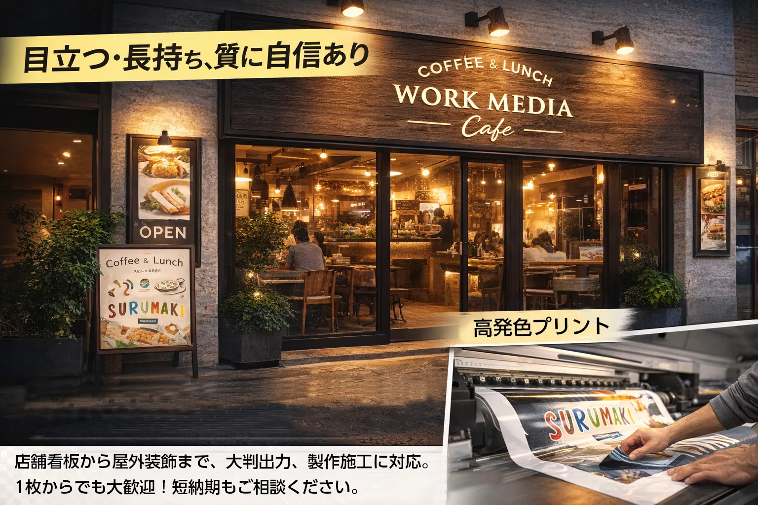 立看板からインテリアのアートフレームまで、1枚から注文可能!大判ポスター印刷は、**最短翌日仕上げ(店頭受取限定)**にも対応。さらに、UV対策ラミネート加工も可能で、長持ちする美しい仕上がりを実現します。納期についても柔軟に対応いたしますので、お気軽にご相談ください!